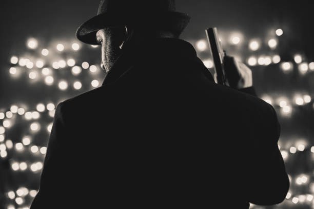 Retro man in coat and hat holding a gun, black and white. Noir style.